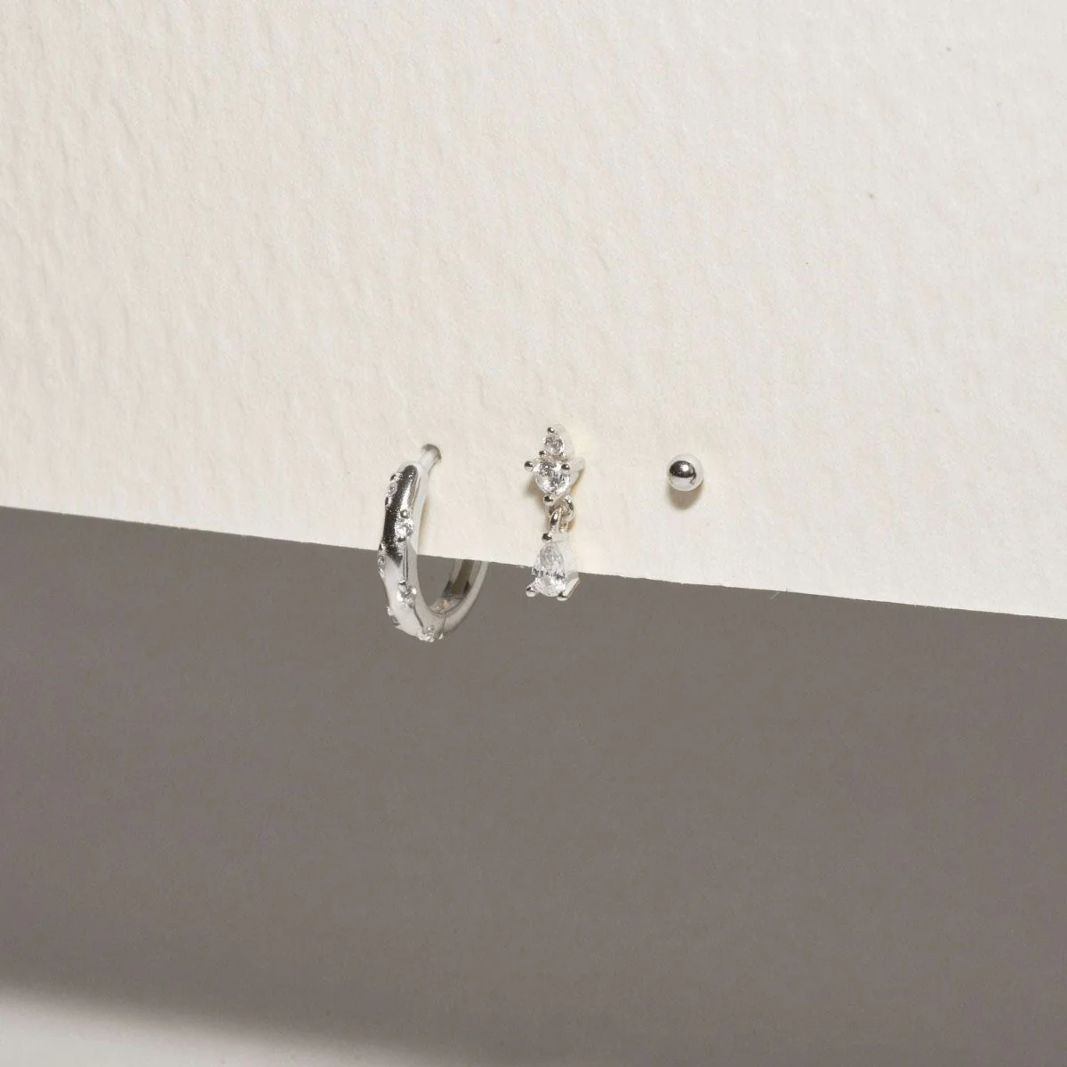 Enhance your style with our Dainty Crystal Earrings Set in Silver, featuring three elegant designs perfect for any occasion. This set includes a dotted huggie hoops, a classic dangle stud with cubic zirconia stone and a minimalist 3mm ball stud, all crafted in sterling silver. Each piece adds a touch of sophistication and versatility to your jewellery collection, making it an ideal gift or a chic addition to your own look. Whether worn together or separately, these earrings bring effortless elegance to any outfit.