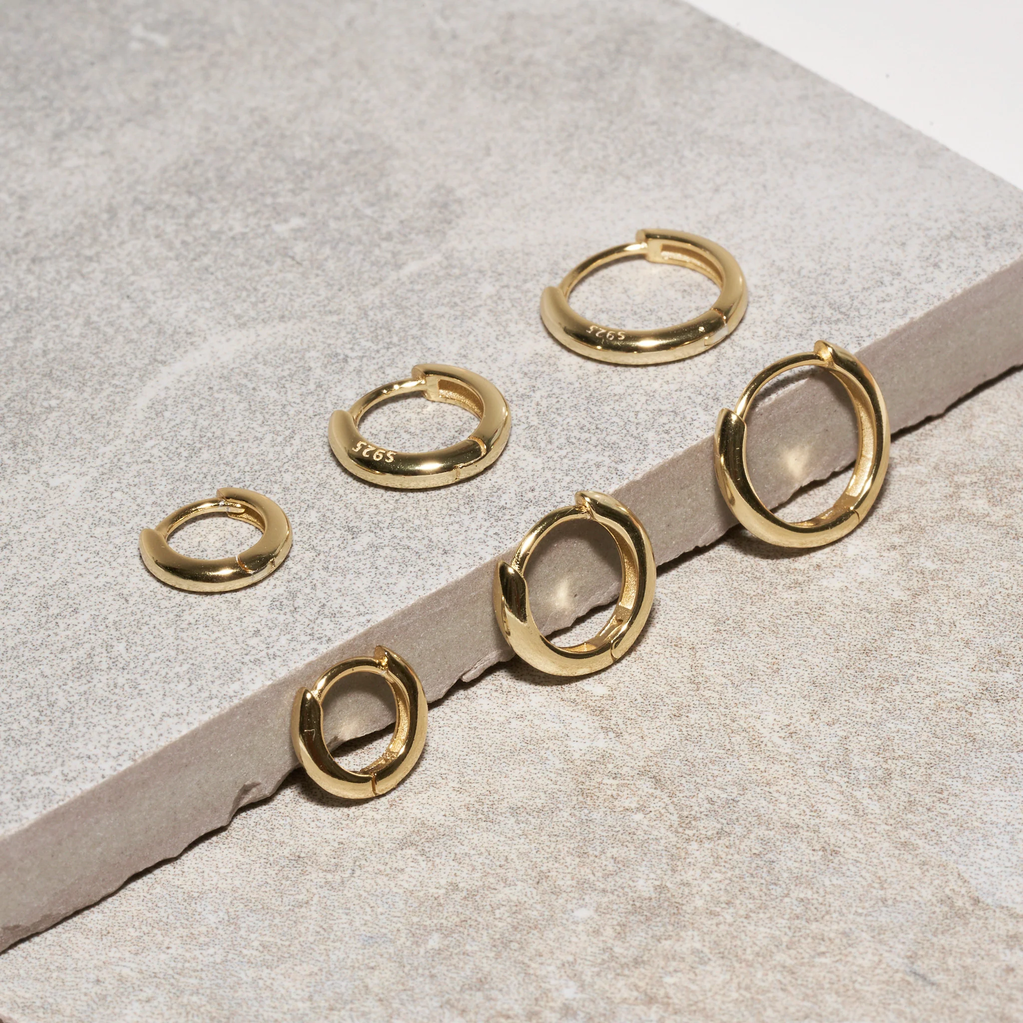 Pure, polished curves. This trio of huggie hoops comes in three essential sizes with a uniform profile for a clean, modern look. They’re lightweight, nickel-safe, and finished with secure hinged clickers—made for effortless stacking from lobe to second/third piercings or helix. Wear one for subtle shine or all three for a sleek ear.