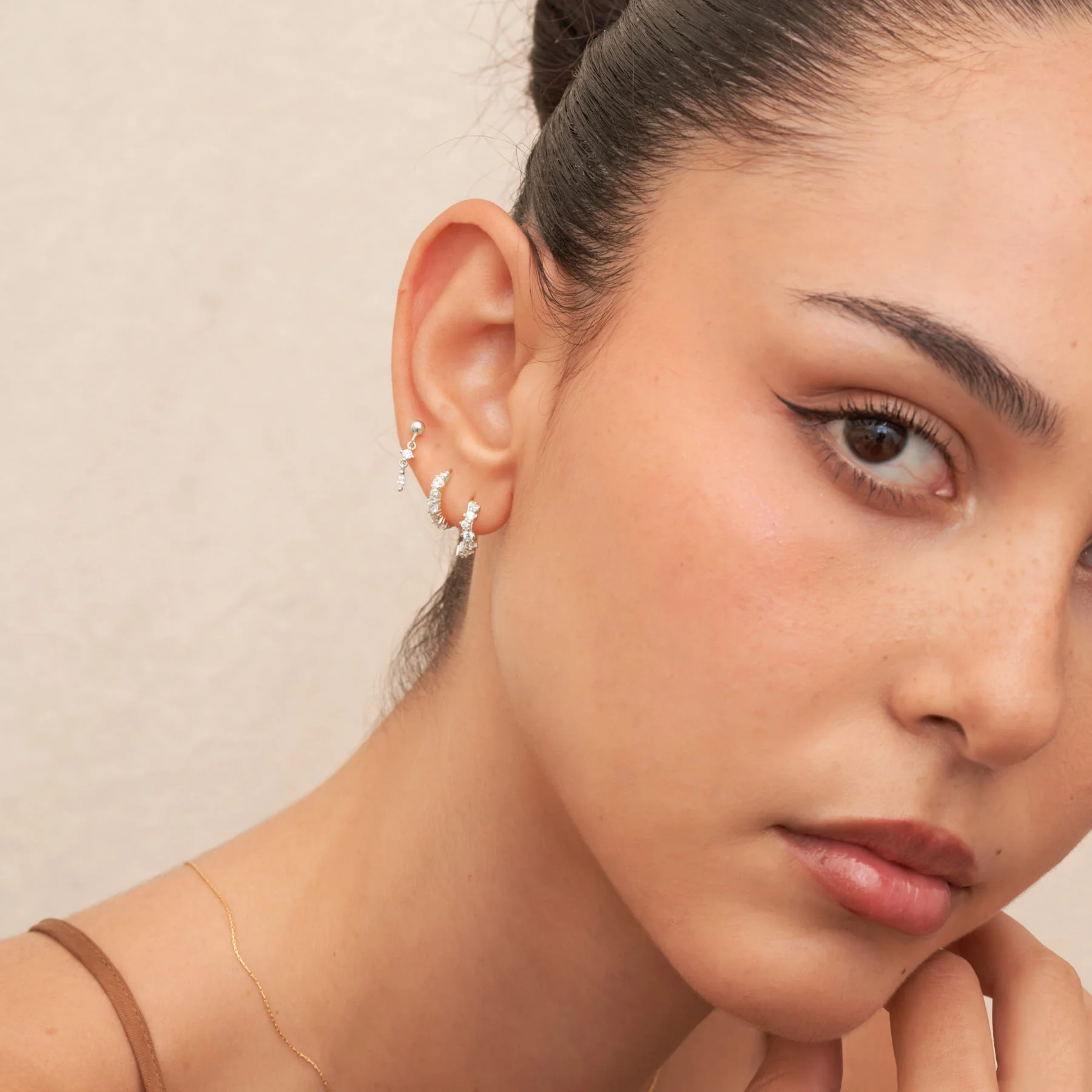 A small drop with big sparkle. A round CZ and a marquise-cut stone hang from a slim chain for subtle movement. The screw barbell back sits flush for a comfortable fit on the helix or upper lobe. 925 sterling silver; hypoallergenic and nickel-free.