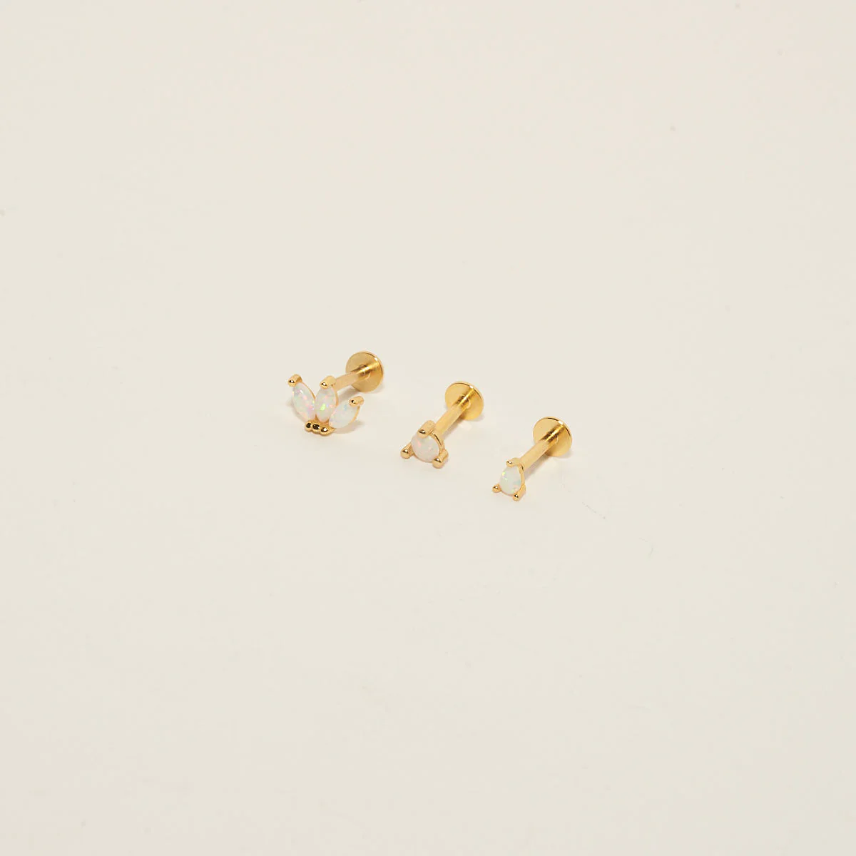Delicate and luminous, this Gold Opal Labret Set features a floral-inspired cluster and two single opal studs—perfect for stacking on lobe, helix, or tragus. Iridescent opals add a subtle glow, while flat-back posts ensure all-day comfort and style.