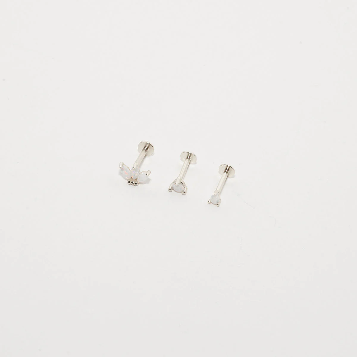 Delicate and luminous, this Silver Opal Labret Set features a floral-inspired cluster and two single opal studs—perfect for stacking on lobe, helix, or tragus. Iridescent opals add a subtle glow, while flat-back posts ensure all-day comfort and style.