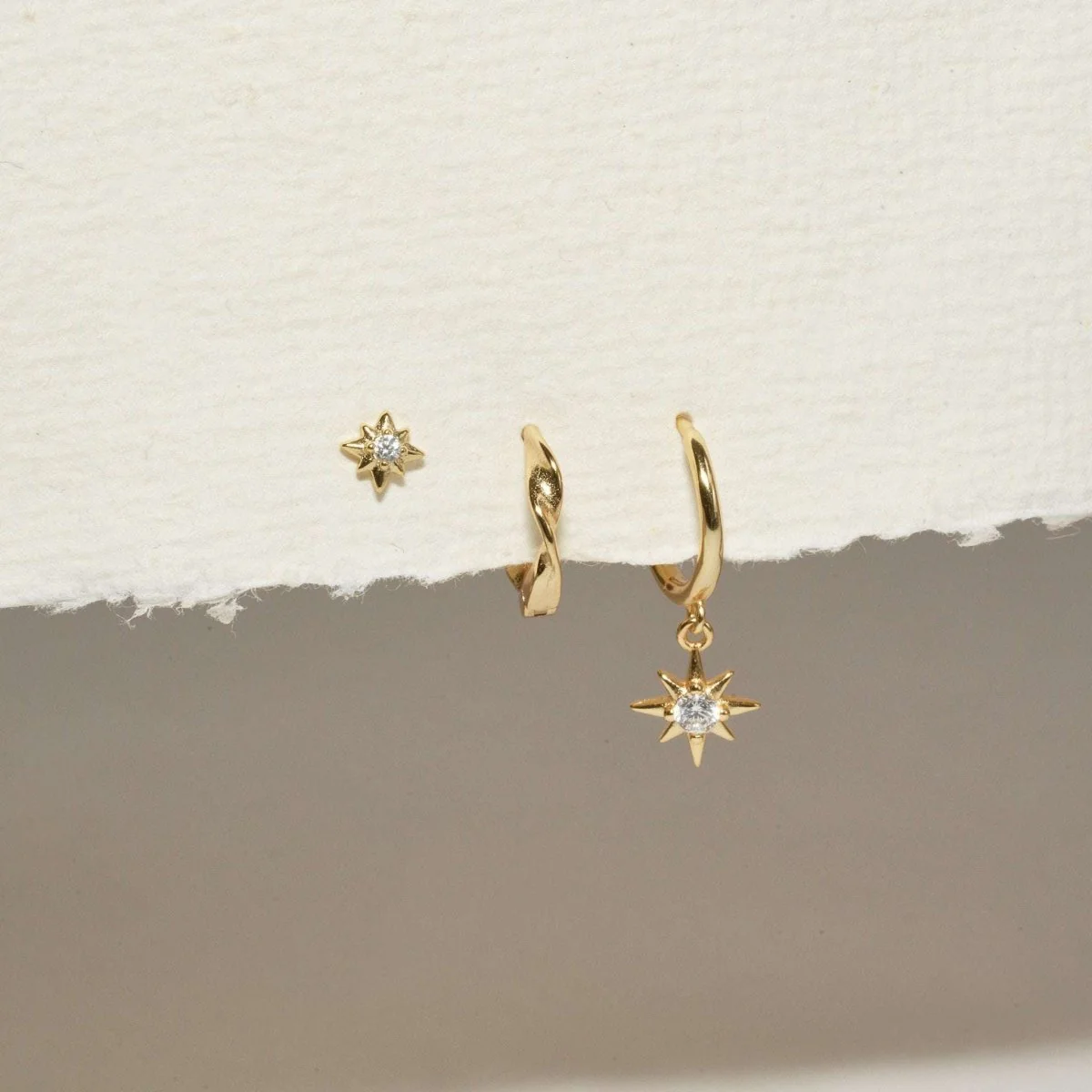 Enhance your style with our Starburst Dangle Hoops Set in Gold, featuring three elegant designs perfect for any occasion. This set includes a dangle hoop with star, a delicate textured huggie hoop, and a dainty star stud, all crafted in 18k gold plated on sterling silver. Each piece adds a touch of sophistication and versatility to your jewellery collection, making it an ideal gift or a chic addition to your own look. Whether worn together or separately, these earrings bring effortless elegance to any outfit.